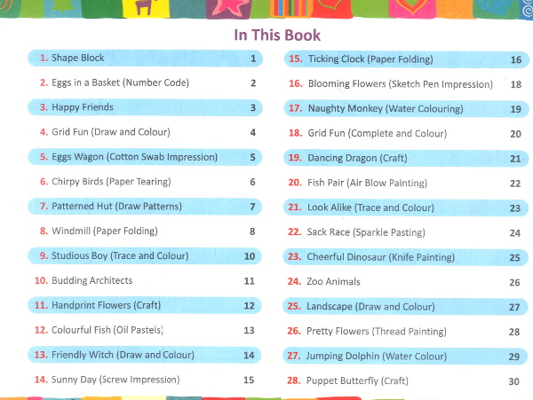- Ample variety of art and craft activity included using various drawing and coloring tools like pencils felt tip pens water colours, pencil colours, different kinds of paints, crayons, oil pastels and many more